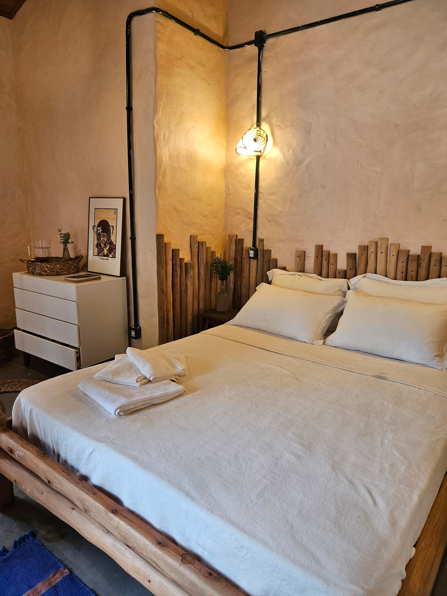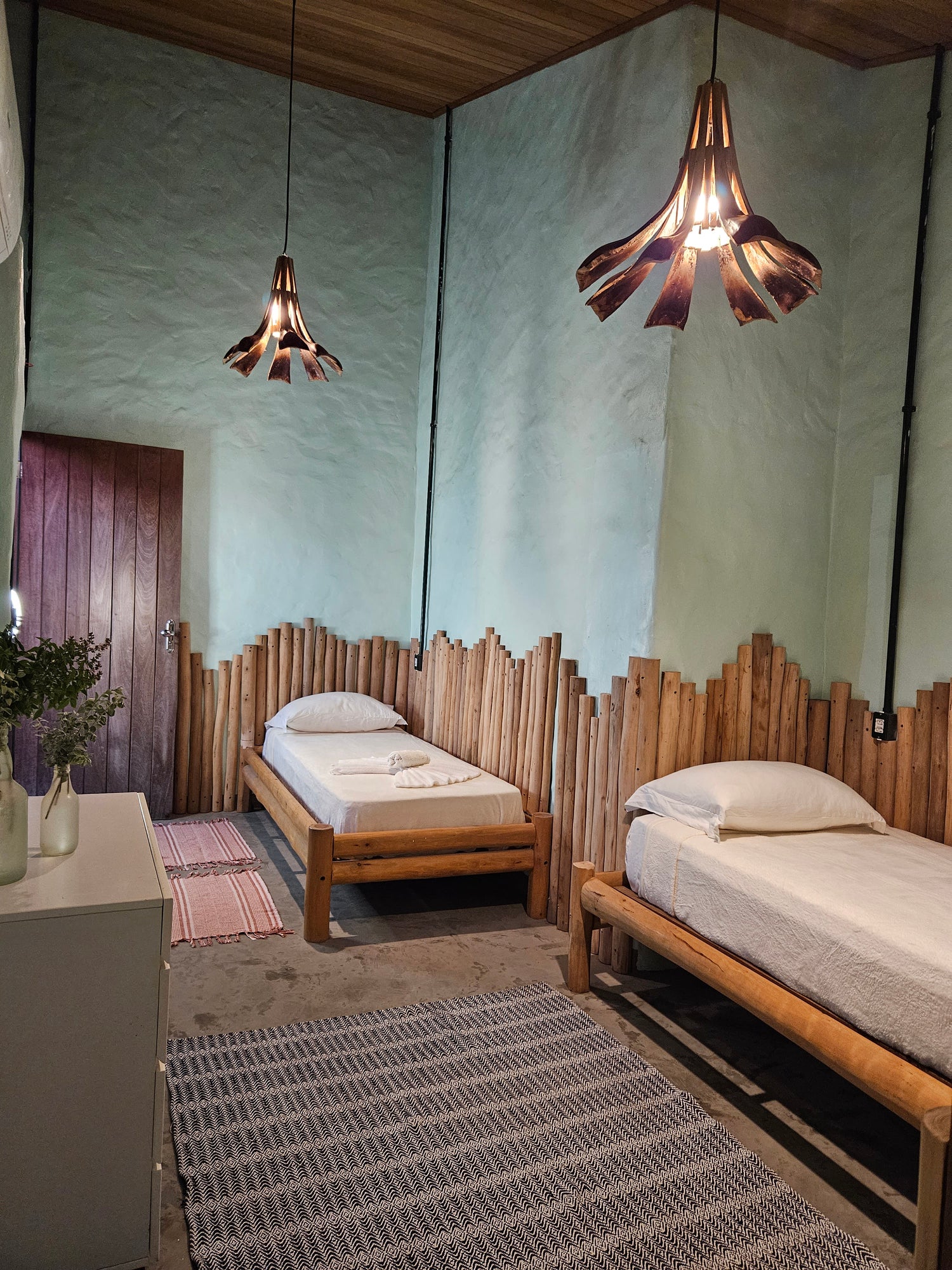 Duas camas de solteiro e uma bicama - podendo juntar e virar uma cama king, banheiro ao ar livre, ar condicionado, armário, e chuveiro elétrico.