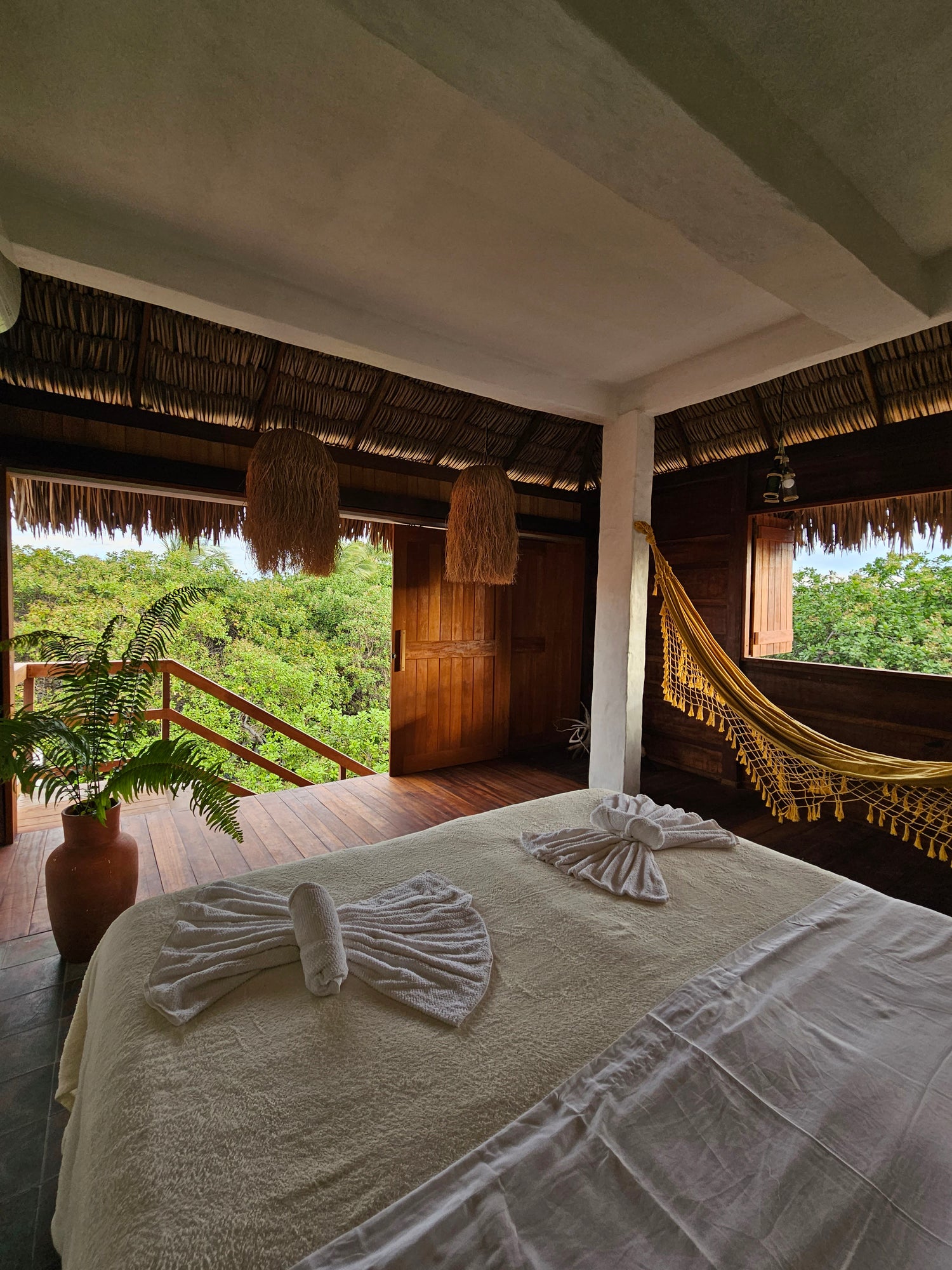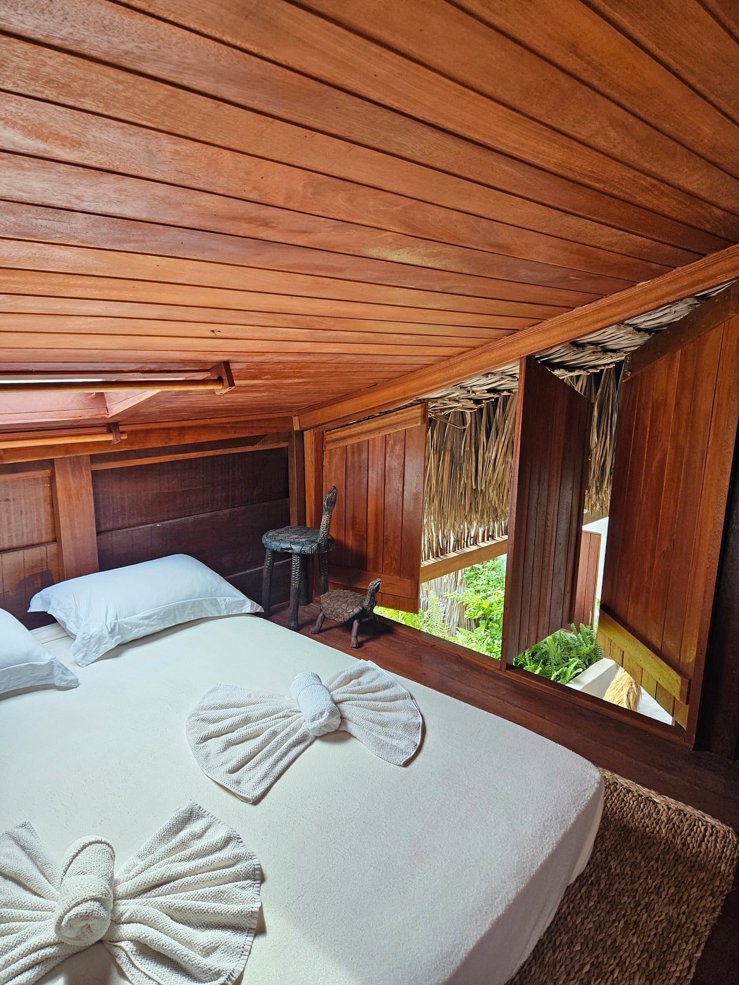 Cama queen, vista para as árvores, ar condicionado, armários com prateleiras e chuveiro elétrico - podendo acrescentar até 1 cama de solteiro no chão com um valor adicional de 120,00 por pessoa