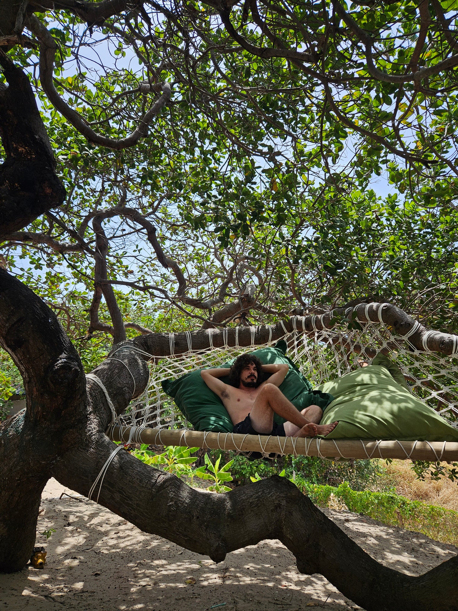 Há um cajueiro com redes e uma mesa para apreciar a vista.